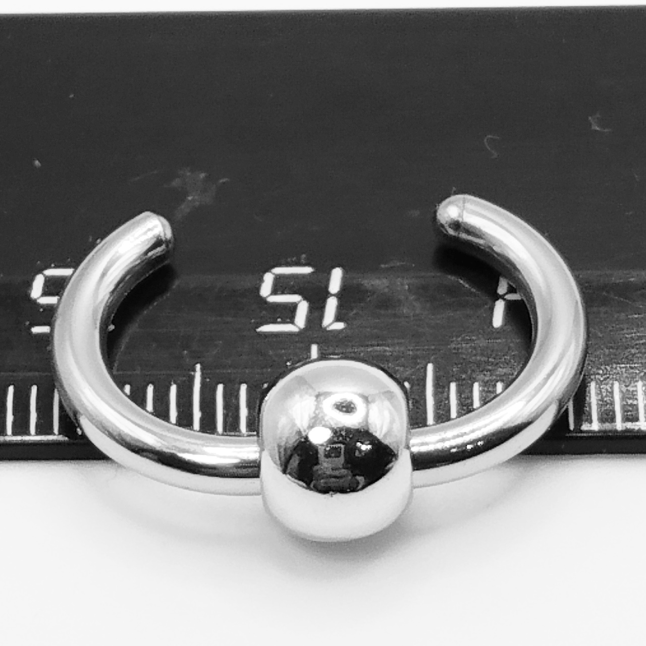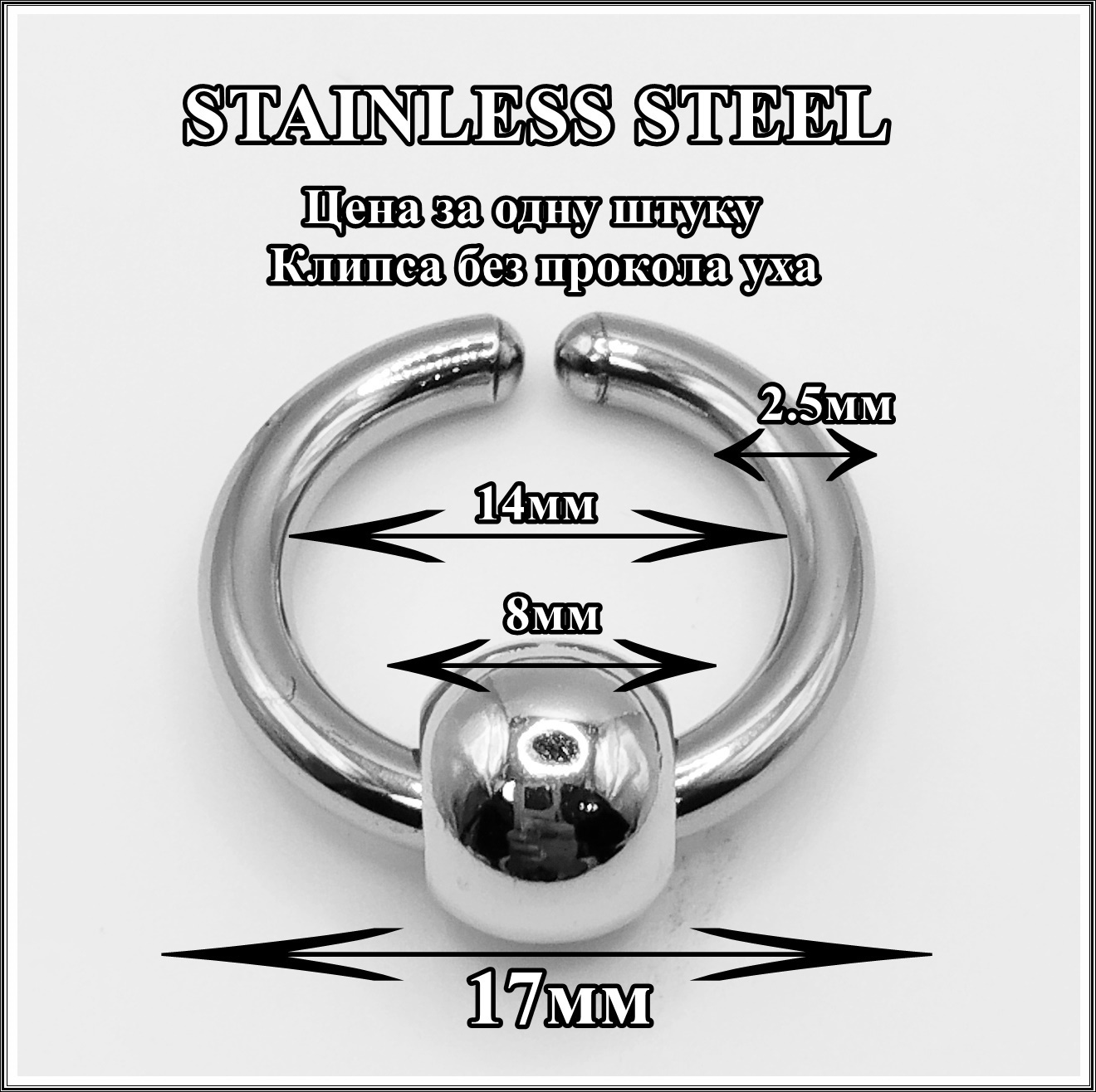 Материал клипсы: медицинская сталь. Диаметр 14мм (внутренний), толщина 2.5мм.