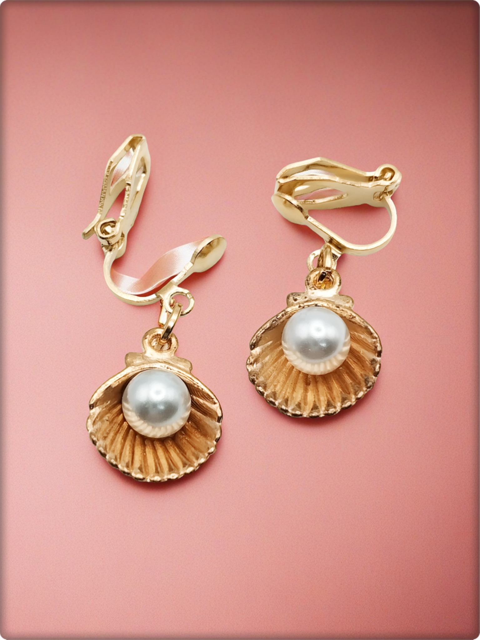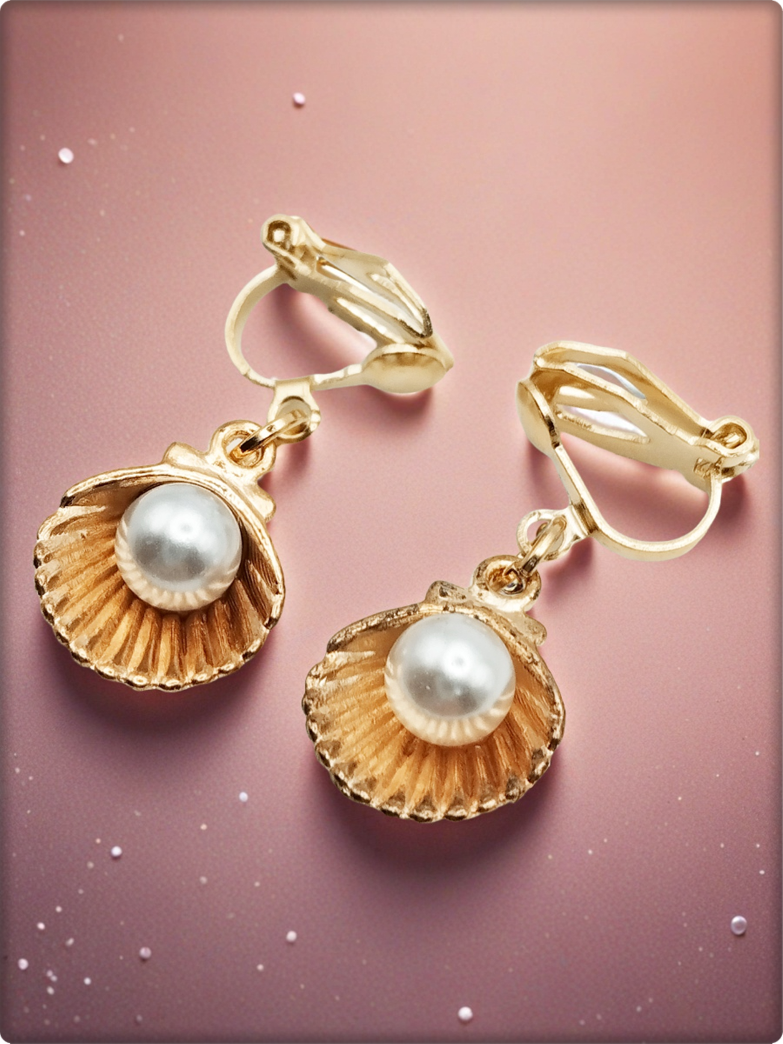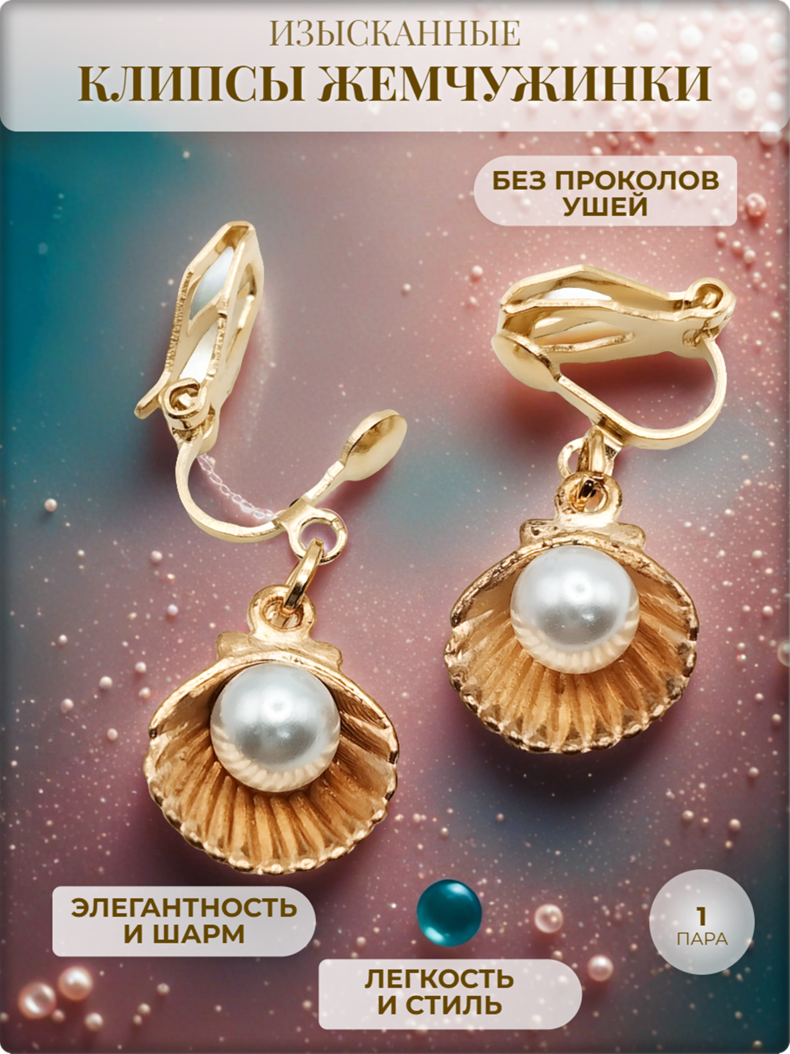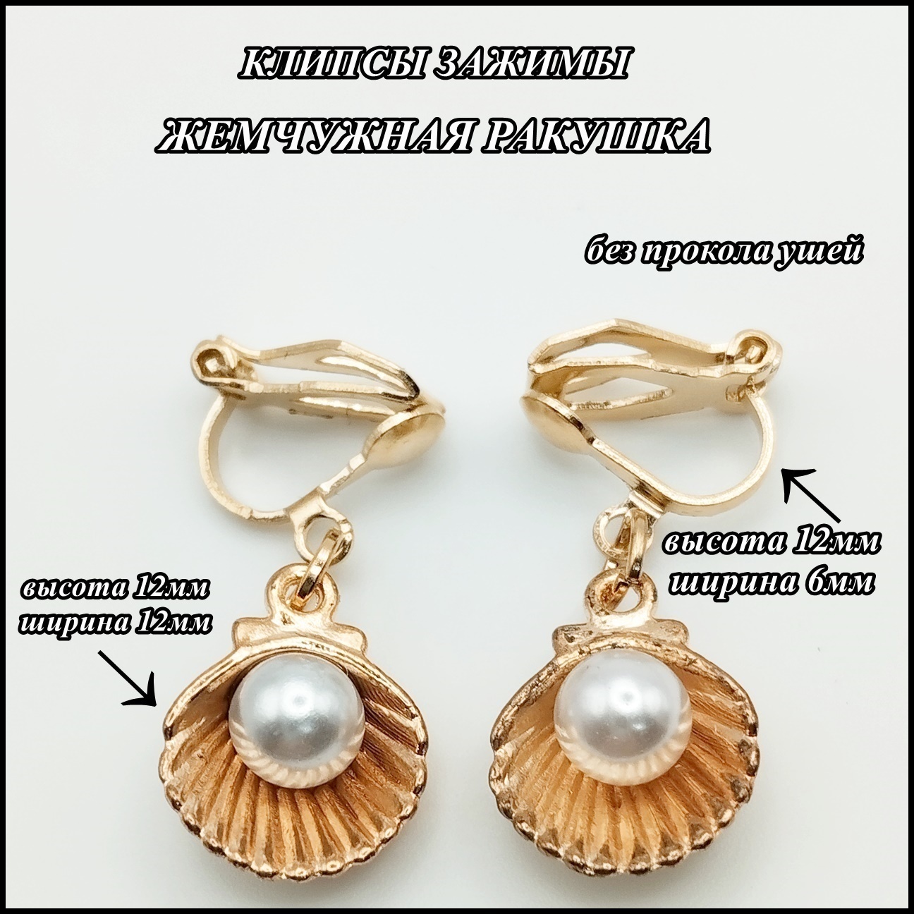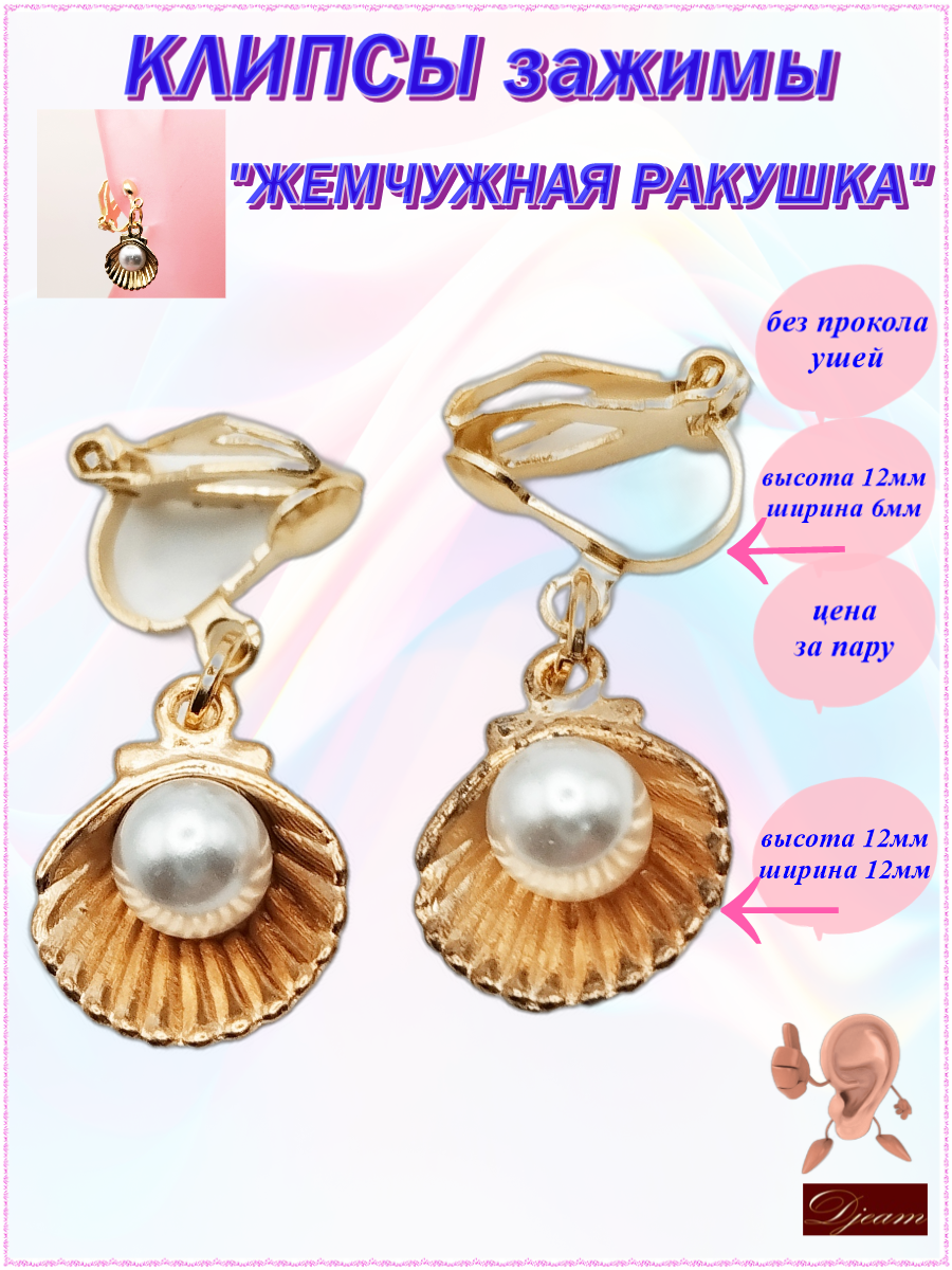 Серьги клипсы (без прокола) с подвеской "Жемчужная ракушка".