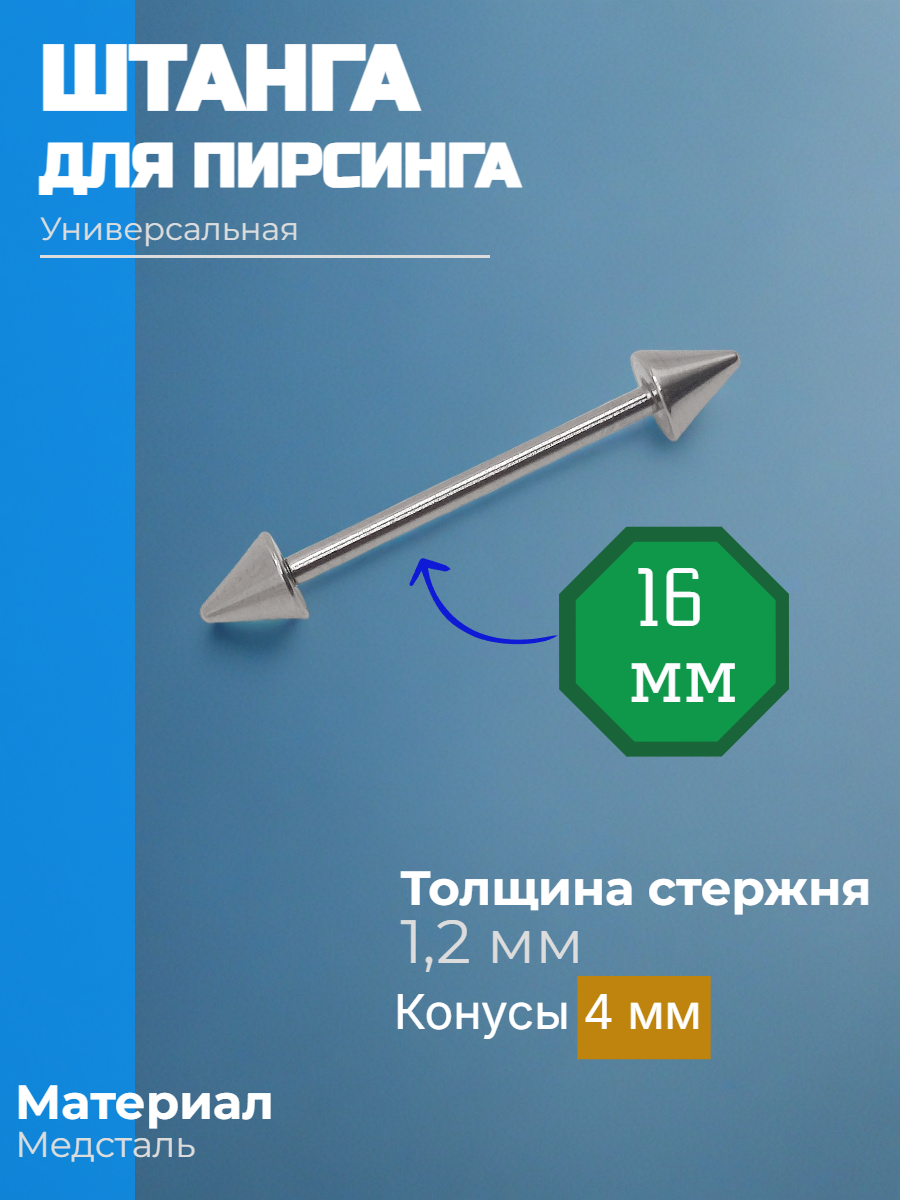 Длина штанги 16 мм, толщина 1,2 мм. Диаметр конусов 4 мм.