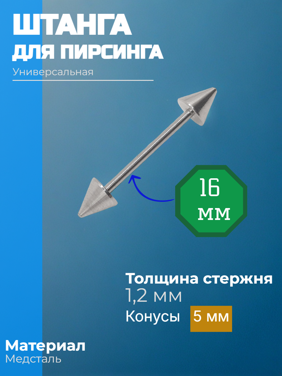 Длина штанги 16 мм, толщина 1,2 мм. Диаметр конусов 5 мм.